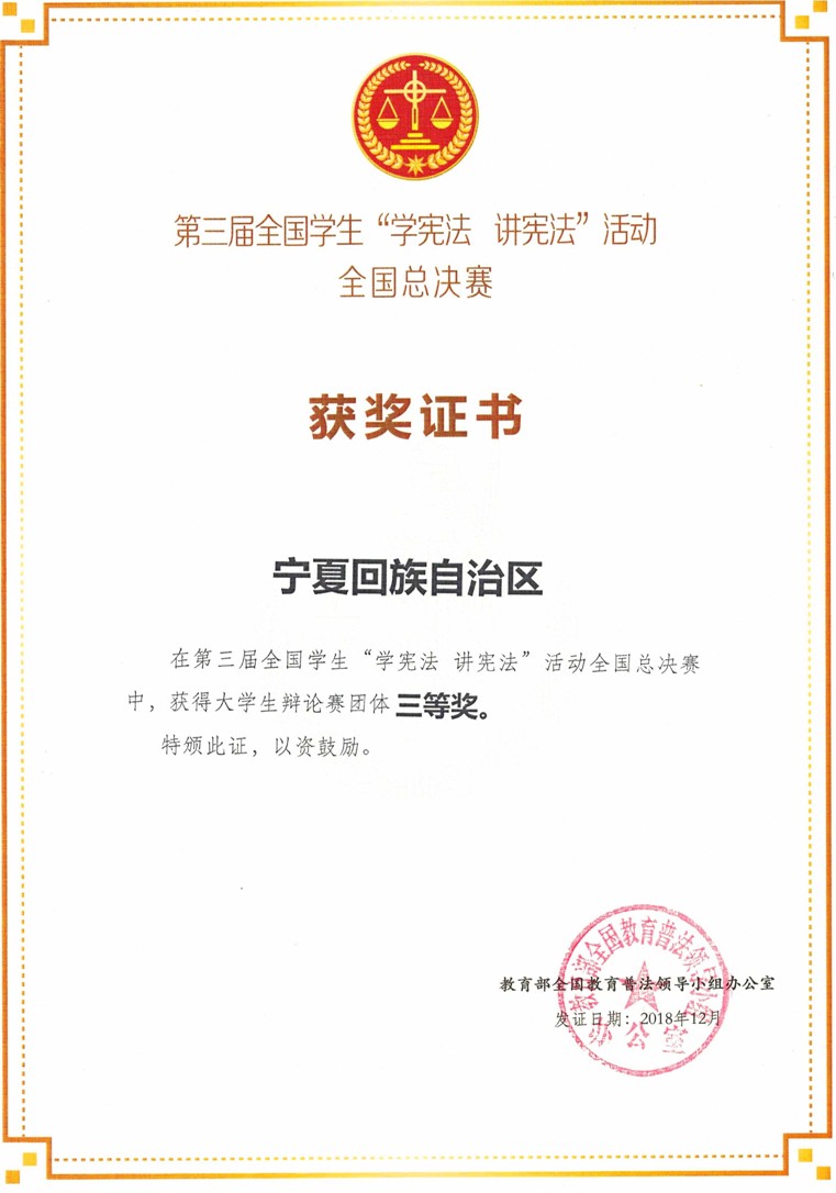 第三届全国学生“学宪法讲宪法”全国总决赛在第五个国家宪法日圆满收关,本次比赛由教育部主办,来自全国各省区、直辖市、香港和澳门特别行政区、新疆生产建设兵团共700余名师生参加了全国总决赛。我院法学专业本科生童鹏、张航溥、毛佳钰与区内其他院校代表组成宁夏回族自治区代表队赴京参赛,最终获得大学生辩论赛团体三等奖,知识竞赛二等奖,张弛和张蕊老师获得优秀指导教师奖。