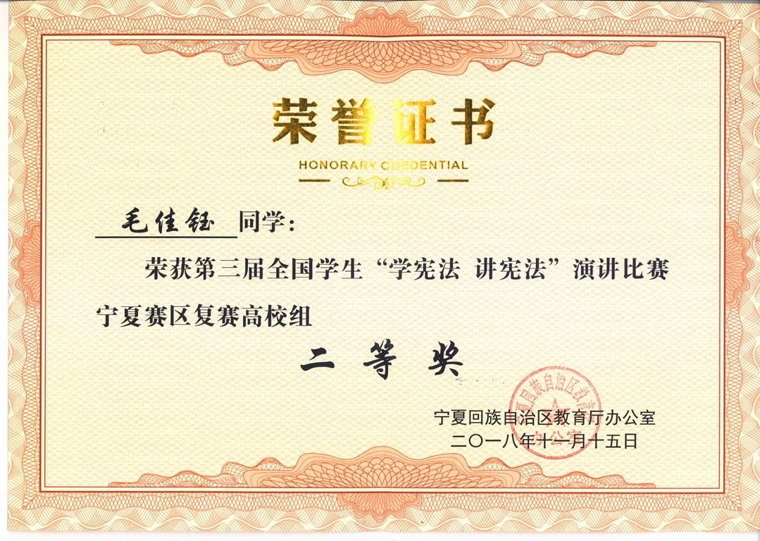 全国学生“学宪法讲宪法”活动已经成为“七五”普法工作的品牌化活动,教育部认真落实中央关于深入学习宣传和贯彻实施宪法的有关精神,按照中宣部、中组部、全国人大常委会办公厅、教育部、司法部《关于组织开展宪法学习宣传教育活动的通知》要求,在2016年和2017年活动的基础上,2018年5月教育部启动了第三届全国学生“学宪法讲宪法”活动。我院毛佳钰、张航溥同学在10月份举行的宁夏赛区复赛中荣获二等奖和三等奖。