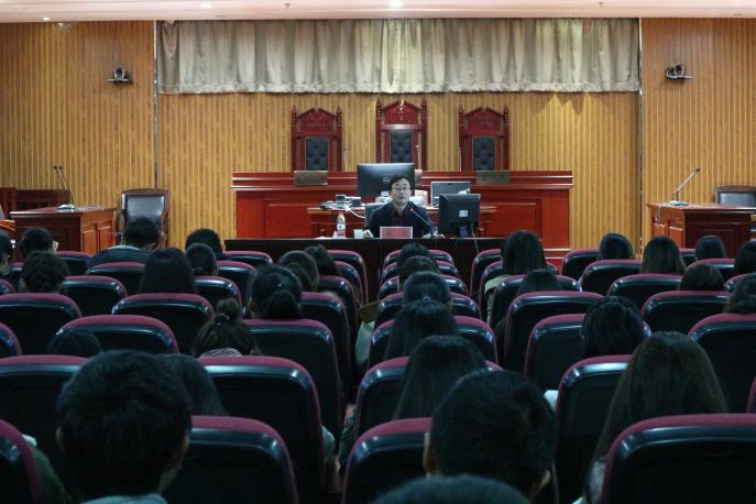 11月8日晚上6点30分,williamhill英国网络文明守纪与安全教育宣讲团团员、学生处副处长张翼老师在贺兰山校区文荟楼模拟法庭,为政william威廉英国2018级全体同学做有关“网络文明守纪与安全教育”主题讲座。