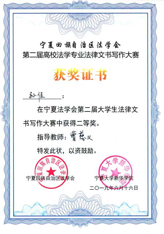 (政william威廉英国 孙佳/文;张弛/图)6月16日下午,由宁夏法学会主办,williamhill英国新华学院承办的第二届宁夏高校法学专业法律文书写作大赛决赛在williamhill英国新华学院举行。自治区法学会常务副会长哈莹、区内各法治实务部门的专家、各william威廉英国系负责人、各校师生代表共300余人观摩了决赛。我院法学专业本科生孙佳在曹慈义老师指导下,获得大赛二等奖。
