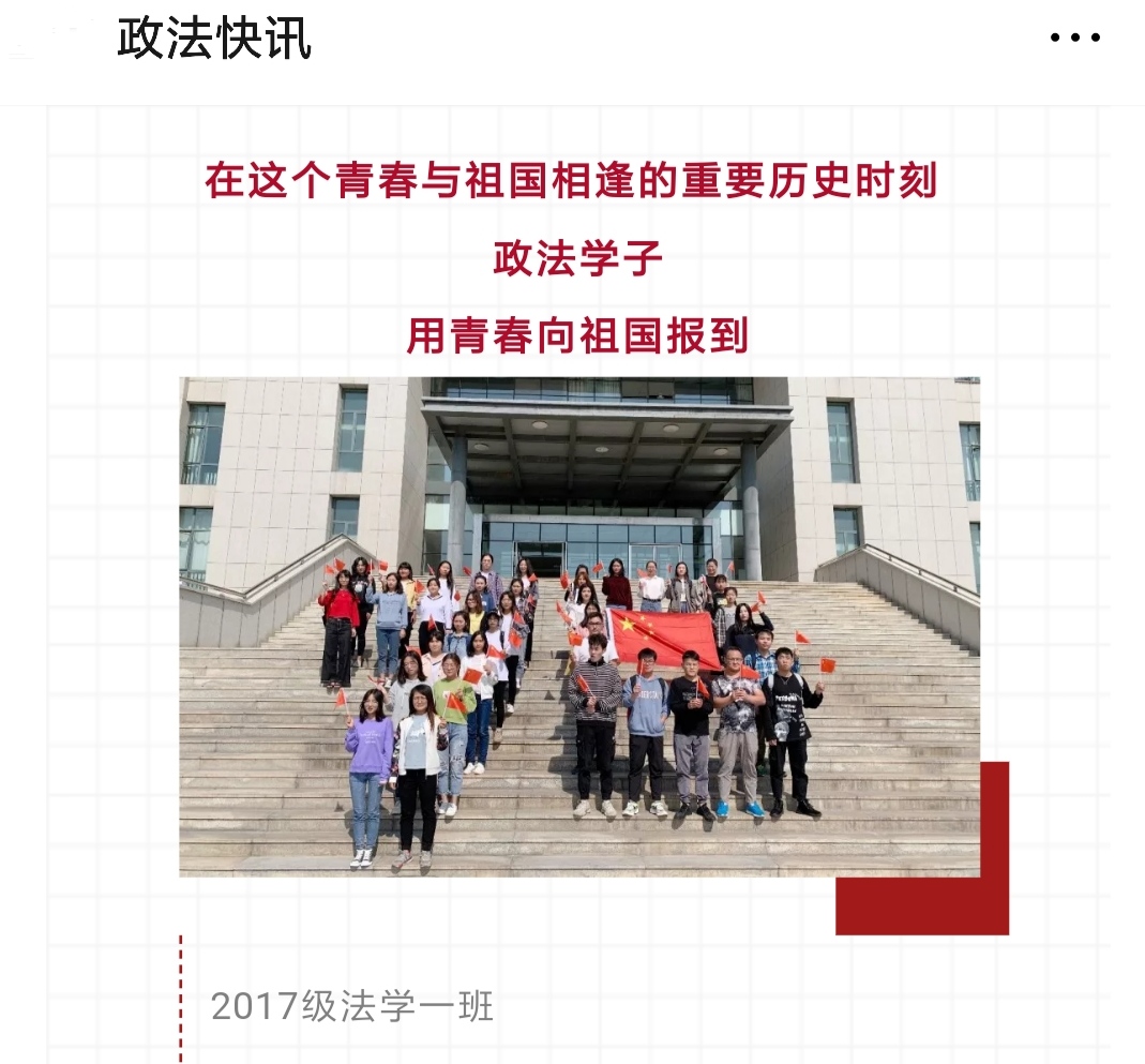 10月1日当天,我院官方微信公众号还推出了国庆特别策划栏目——《国庆节|用青春向祖国报到》,政法学子通过各种形式,向祖国表达美好祝福。