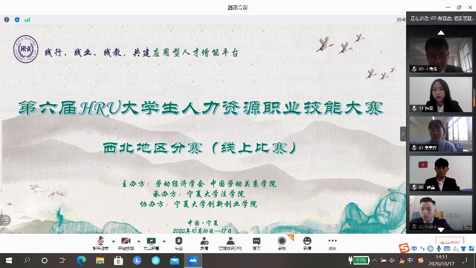 2020年10月17日上午,由劳动经济学会、中国劳动关系学院联合主办,william威廉英国承办,williamhill英国创新创业学院协办的第六届中国大学生人力资源职业技能大赛西北赛区(线上比赛)在williamhill英国贺兰山校区顺利举行。
