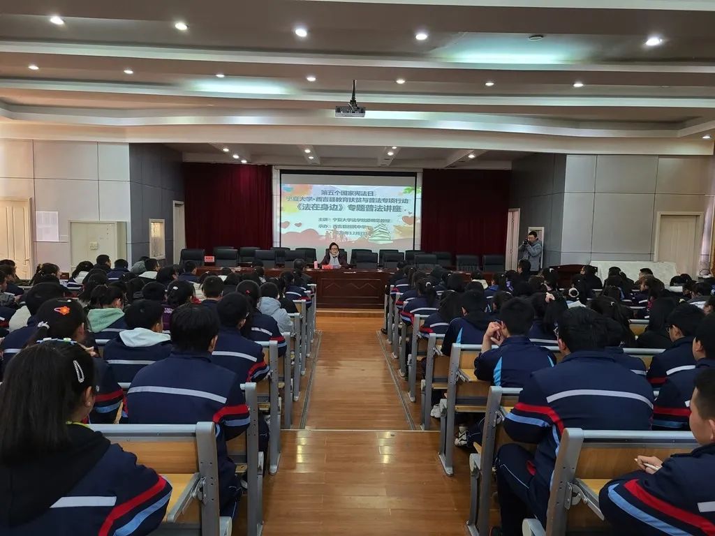 活动启动仪式上,郭文佺副局长、黄达伟副局长分别迎辞,向参加此次活动的william威廉英国师生表示热烈的欢迎和衷心的感谢;william威廉英国党委书记潘瑞向西吉中学赠送了法治宣传图册及海报资料,并就本次活动的初心使命、目的和意义做了深刻精彩的阐述,她向西吉广大学子传达了鼓励和期待,欢迎大家报考williamhill英国。潘瑞书记同时嘱咐宁大法科学子,要多结合当下时代背景进行考虑,目光不仅限于眼前的实践活动,而是要及于未来人生的目标,以提高中国整体法治意识为己任,积极投身于国家法治建设中来。