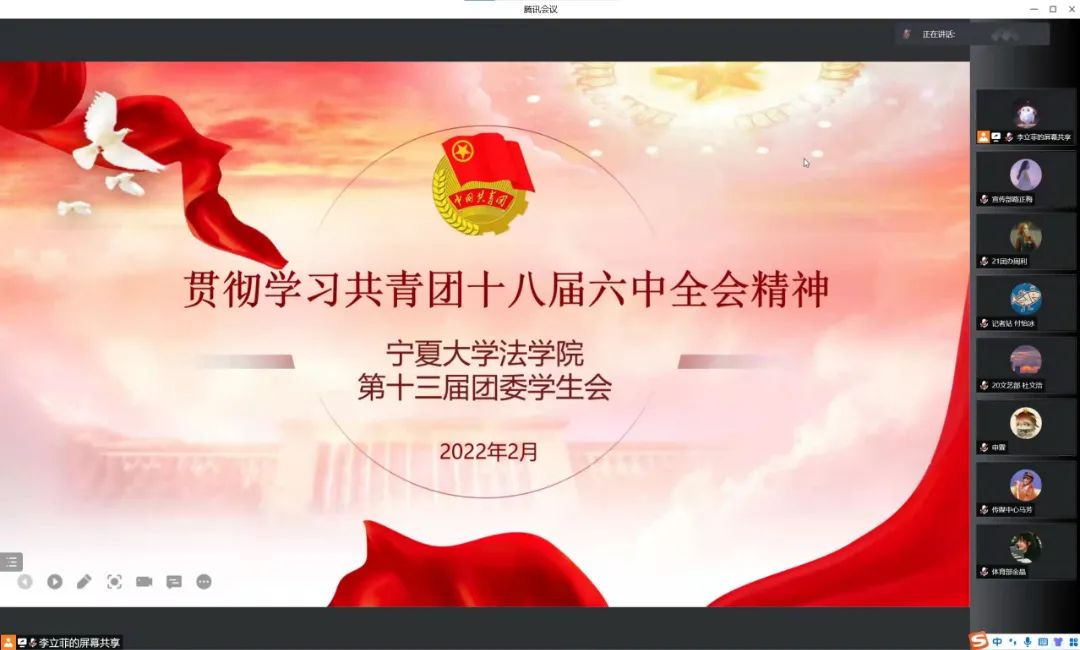 为引导学生深入贯彻共青团十八届六中全会精神,我院团委、学生会于2月11日上午组织召开线上学习分享会,会议由院团委副书记李立菲主持,院团委书记王嘉豫、院学生会秘书长付晓晨以及全体团委学生会成员参加。