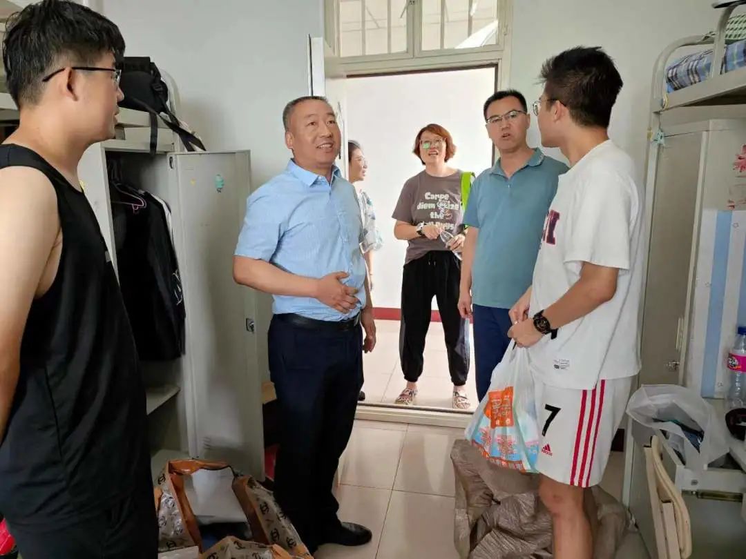 在同学们搬至金凤校区之后,李治涛、吕耀军一行逐一走访学生宿舍,分发慰问品,与同学们交流搬迁过程中遇到的问题、期末考试情况、假期安排等,叮嘱大家注意假期安全,切实让同学们感受到学院的关怀。