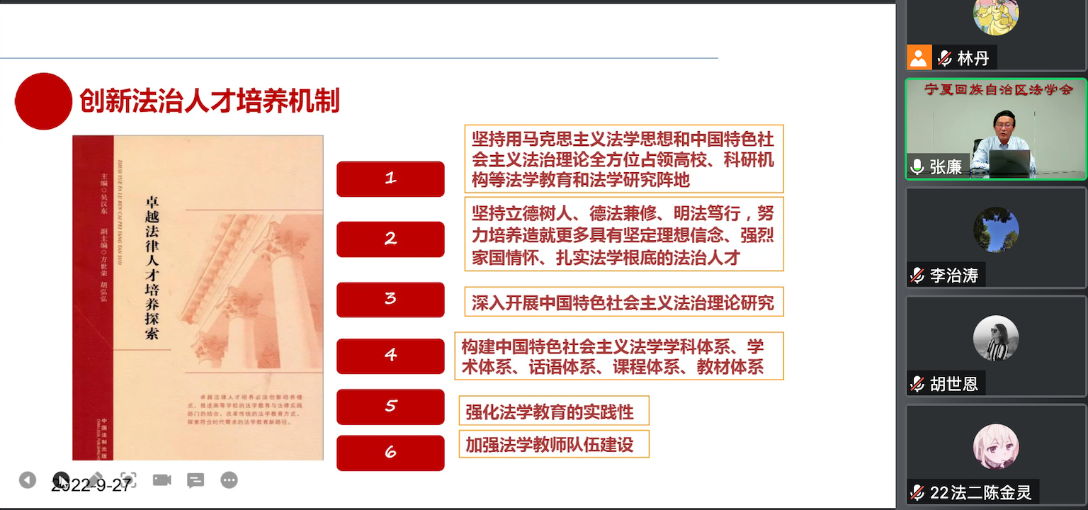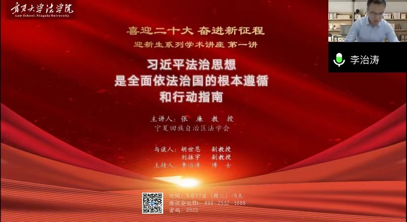 为深入推进习近平法治思想进校园、进课堂、进头脑,引导学院师生不断强化理论武装,深刻领悟“两个确立”的决定性意义,不断增强“四个意识”、坚定“四个自信”、做到“两个维护”,9月27日晚七点,william威廉英国迎新生系列学术讲座精彩开讲,特邀宁夏回族自治区法学会党组书记、常务副会长张廉教授为全院师生带来首场题为《习近平法治思想是全面依法治国的根本遵循和行动指南》的线上讲座,深入解读习近平法治思想的重大意义、丰富内涵、科学方法