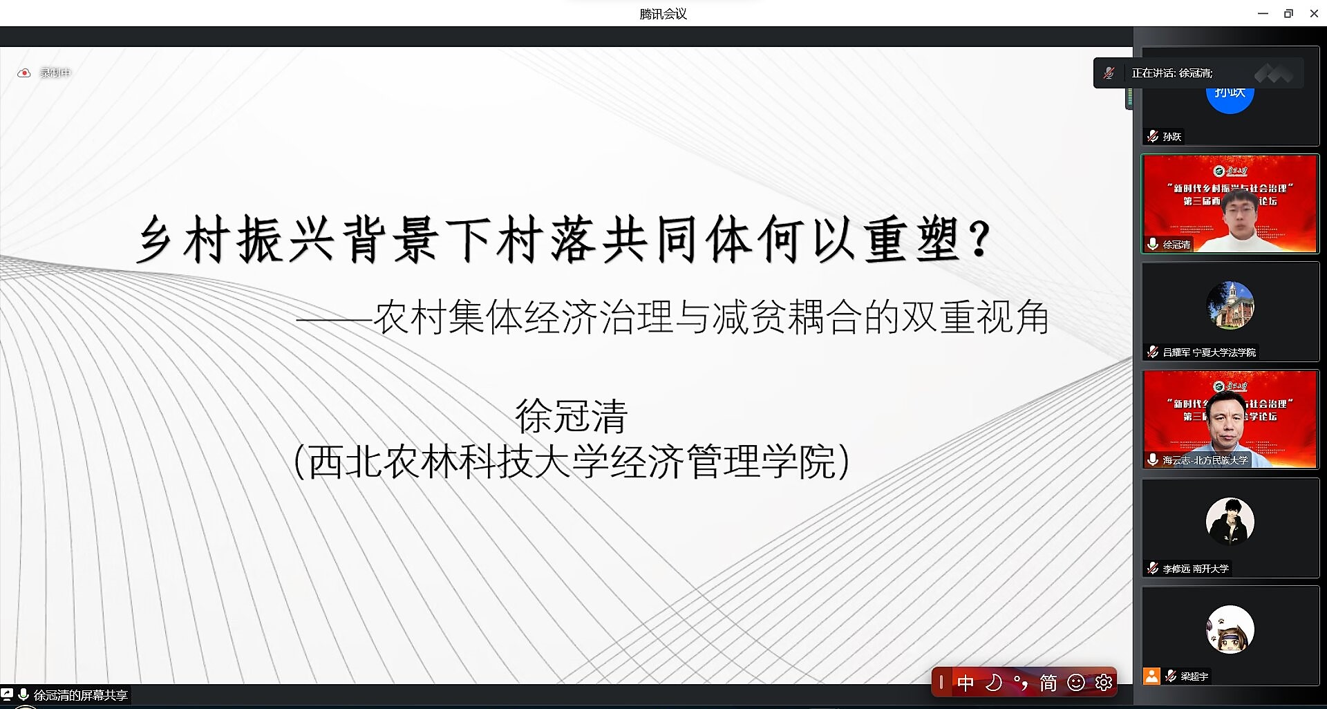 徐冠清等12位博士研究生围绕乡村振兴和社会治理的主题,分别阐述了各自的学术论文和研究。各位博士研究生从不同的切入点对当前我国农村发展和治理中出现的关键问题和治理困境提出了例如发展农村集体经济、数字乡村、农村机制优化、村落共同体的重塑等一系列有效的治理途径。海云志对各位博士的研究论文进行了点评,给予了肯定。