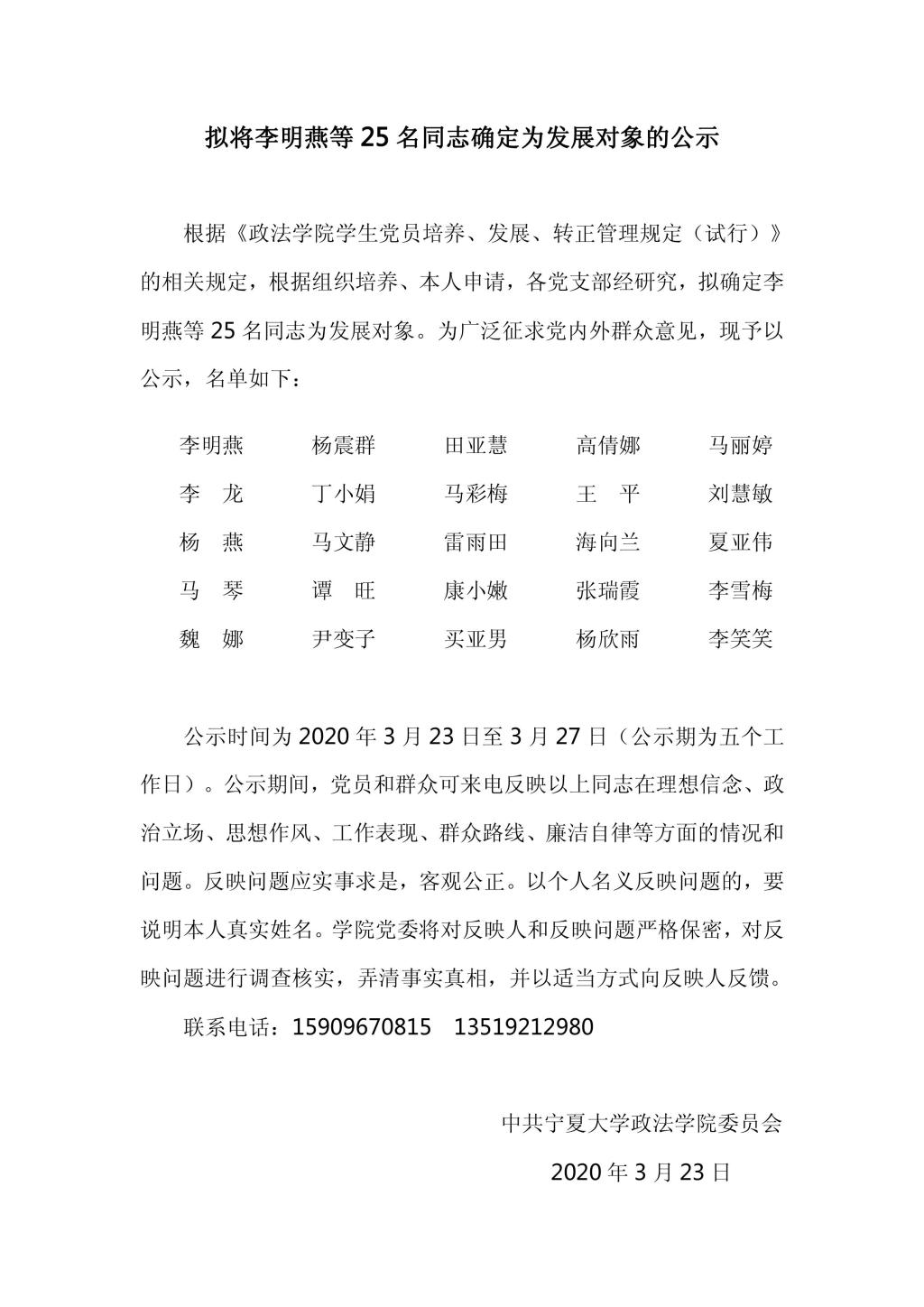 拟将李明燕等25名同志确定为发展对象的公示