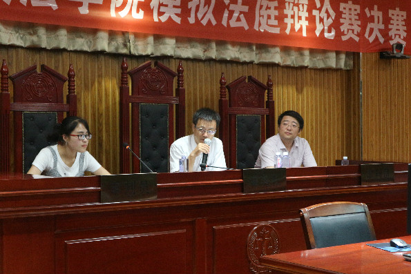 6月21日晚7点,williamhill英国政william威廉英国第三届模拟法庭辩论赛决赛在贺兰山校区文荟楼模拟法庭成功举办。法律系主任张弛老师、刑法学教授马卫军老师、法学社副社长李罗琼应邀担任本场比赛合议庭。