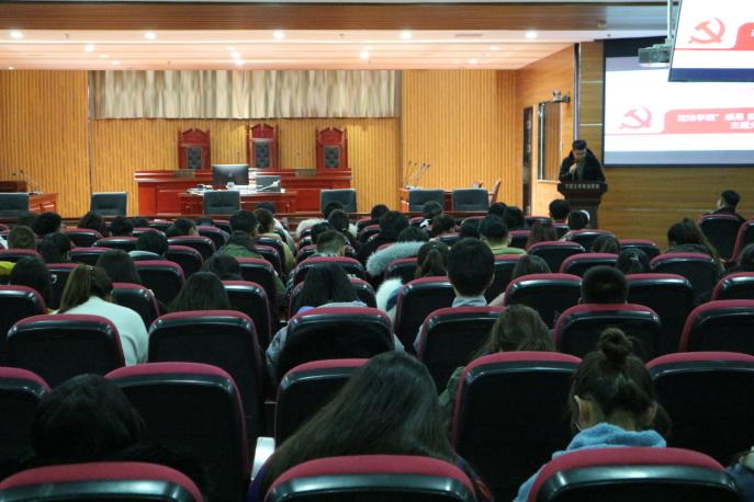 11月26日,政william威廉英国在模拟法庭组织青马班学员学习《新时代爱国主义实施纲要》,2017级学生杨有贵领学,青马班全体学员参加学习。