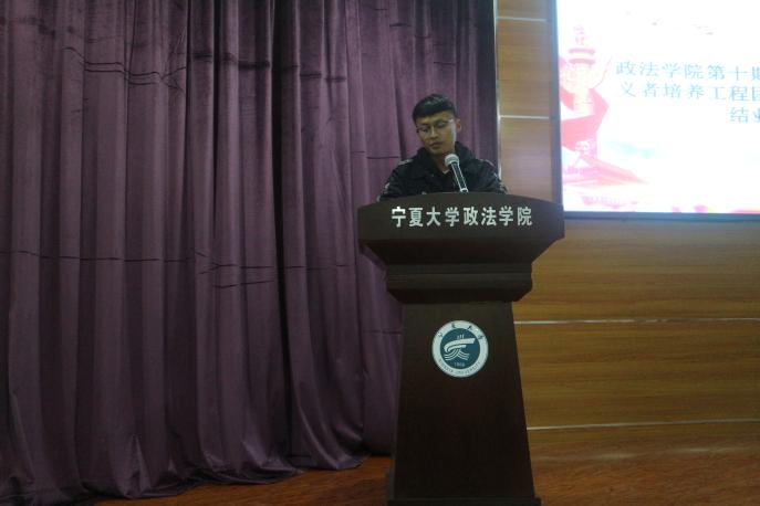 本次典礼分为三项举行。首先,由2017级行政管理专业杨有贵同学和2017级思想政治教育专业李驰同学作为学员代表发言。两位学员做出表态,学生干部们将始终保持理想信念,踏实苦干。随后,团委书记苏军峰老师为第十期青马班成员颁发结业证书,并合影留念。典礼最后,苏老师对第十期青马班培训历程进行回顾及总结,并对团学骨干们提出要求与希望。他指出,青年团学骨干要自律自省,始终保持坚定理想。希望学员们能够深刻领会马克思主义精神,以社会主义核心价值观为引领,为社会主义建设添砖加瓦。