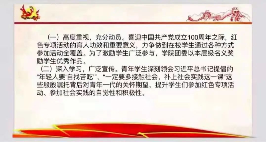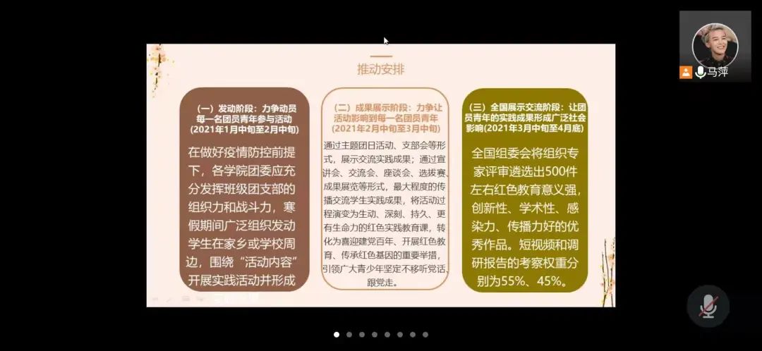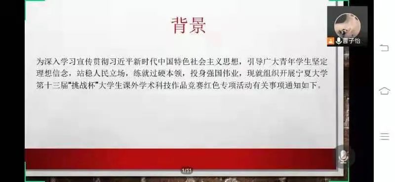 此次团日活动采用线上形式开展,旨在向广大同学进行赛事宣传。各支部活动中,主持人向同学们详细介绍第十三届“挑战杯”大学生课外学术科技作品竞赛暨红色专项实践活动的相关内容,并对同学们提出的问题进行了详尽细致的解答,让参加活动的每一位同学深入了解赛事的详细情况、注意事项以及重要意义。同学们对此次赛事表现出了浓厚的兴趣。