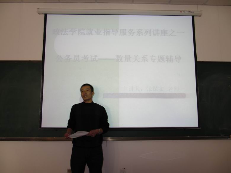 通过公务员考试走上工作岗位是我院毕业生就业的主要途径之一,公务员应试能力培训是我院毕业生就业指导服务工作的重点,2010年国家公务员考试在即,为引导广大考生做好最后阶段的冲刺,针对考生在行政能力测试考试中存在的问题,11月6日至7日,我院特邀请数学计算机学院张保文老师在文科楼111教室开展了相关的公务员应试——数量关系讲座。来自我院及其他兄弟院系80余名学生聆听了讲座。
