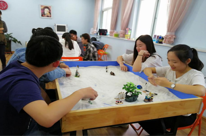 在活动宣言“在这里,留下你们的故事,带走我们的快乐……心的起点,梦将启航!”的感召下,体验式团体沙盘活动拉开了序幕。校心理健康中心的张博老师以随机抽取的方式,将同学们分成三组,引导大家进行富有新意的自我介绍、团队建设。大家在音乐中触摸沙子,流沙绕指,重温童年。在第一个游戏中,各小组成员在不相互交流的前提下,从诸多玩偶中取出三个能够代表友情的玩偶放在沙盘中,让其他队友依次猜测自己拿的玩偶的寓意,最后每个人分别叙述寓意。第二个游戏依旧是在无任何交流的情况下拿三个玩偶,但要求将小组内的玩偶组成一个故事,每个人在沙盘上只能调整自己玩偶的位置,在无语言交流的情况下,通过队友的摆放不断调整自己玩偶的位置,在不断尝试与合作下最终组成一个共同的故事,并由一个代表进行介绍。