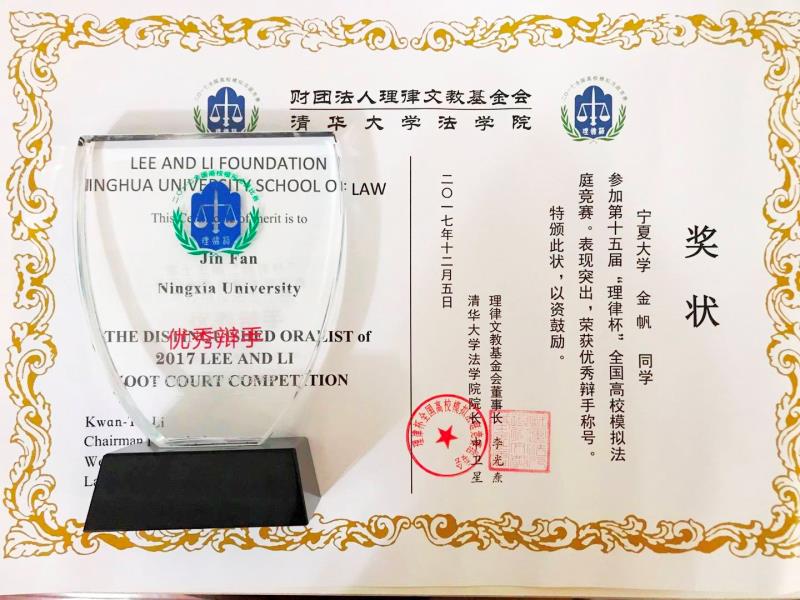 2017年12月1日至12月5日,第十五届“理律杯”全国高校模拟法庭竞赛在清华大学william威廉英国举行。本届赛事邀请了中国人民大学、北京大学、武汉大学、中国政法大学等国内40所高校参赛,williamhill英国政william威廉英国连续第四年受邀参赛。2015级法学一班的金帆同学获得优秀辩手奖。