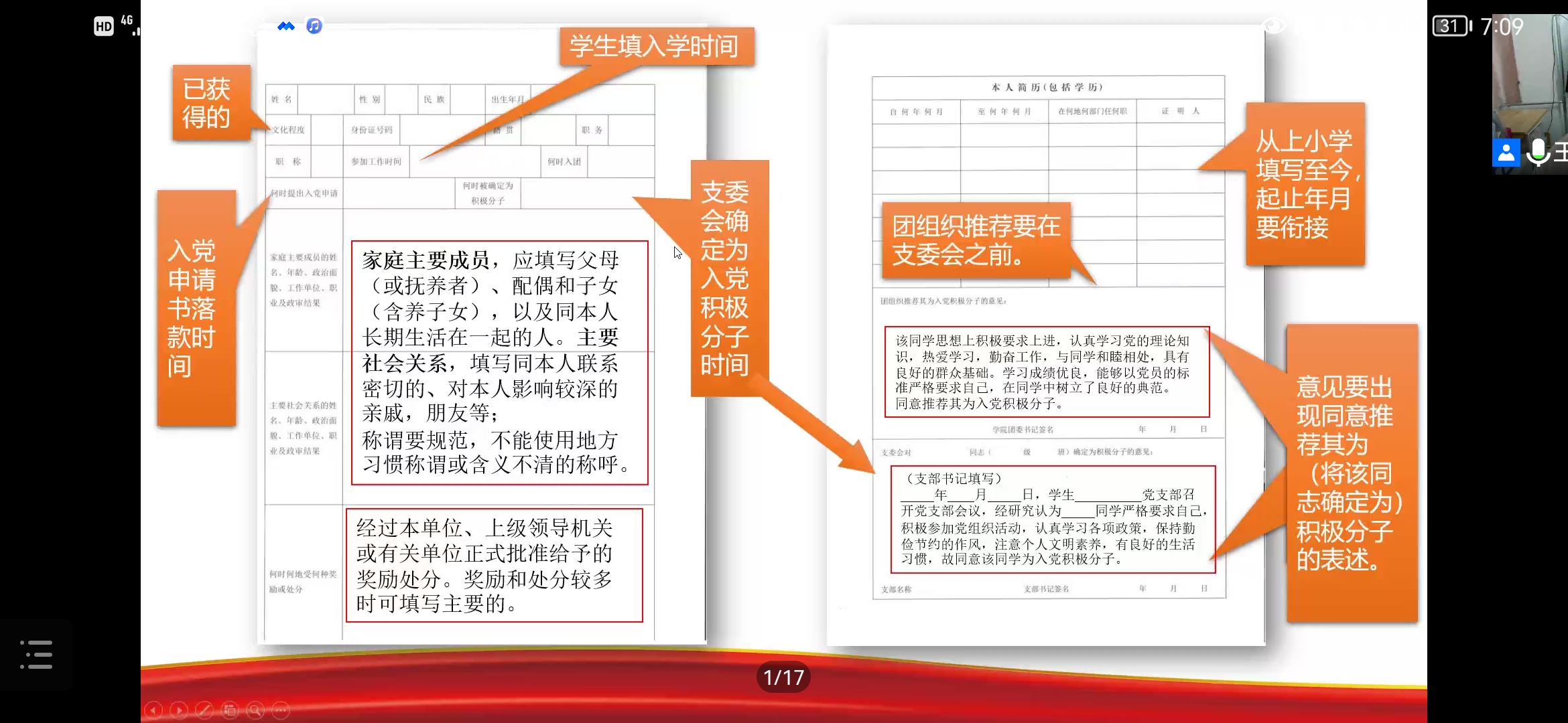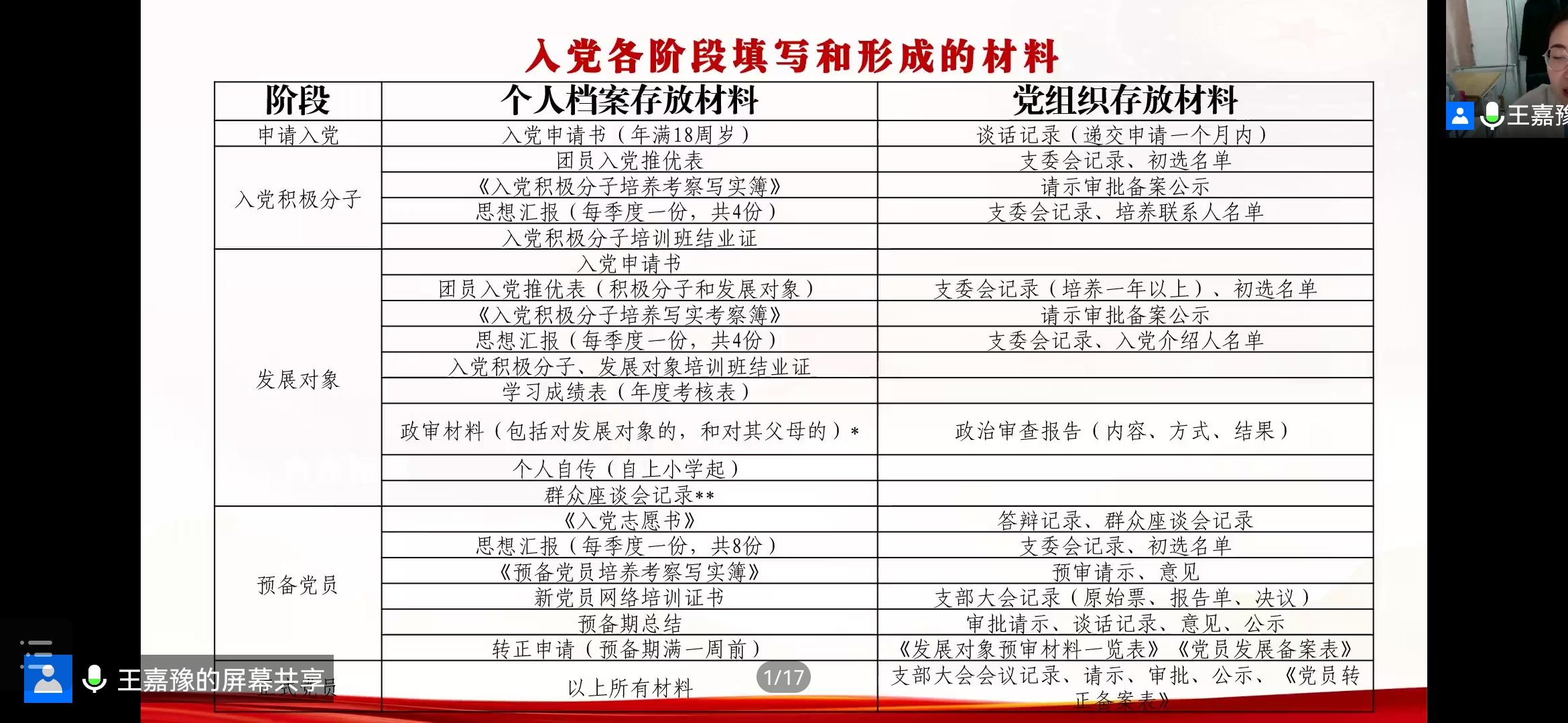 此次培训,王嘉豫就如何填写入党材料进行了详细的讲解。培训伊始,王嘉豫向学员们展示了中国共产党发展党员工作流程图,帮助学员们明确了入党流程以及发展党员所要求的必要条件。随后对发展党员过程中的常见问题一一作出解答,针对入党各阶段需要填写的材料,以表格的形式详细列出。对于入党常用文书写作进行了重点强调,并针对其中的字体、内容、注意事项、文章排版等进行了说明。最后,她重点针对入党积极分子培养考察写实薄中的内容进行了分析和说明。