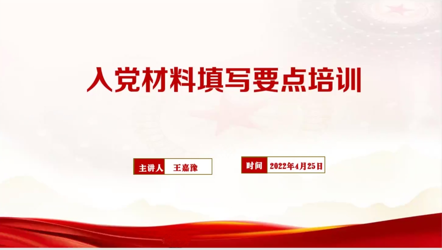 4月25日晚,学院团委书记王嘉豫为我院分党校第四十一期入党积极分子、第十五期发展对象培训班和第十四期“青年马克思主义者培养工程”暨团学骨干培训班于线上开展以“入党材料填写要点”为主题的党课培训,培训班全体学员参加。