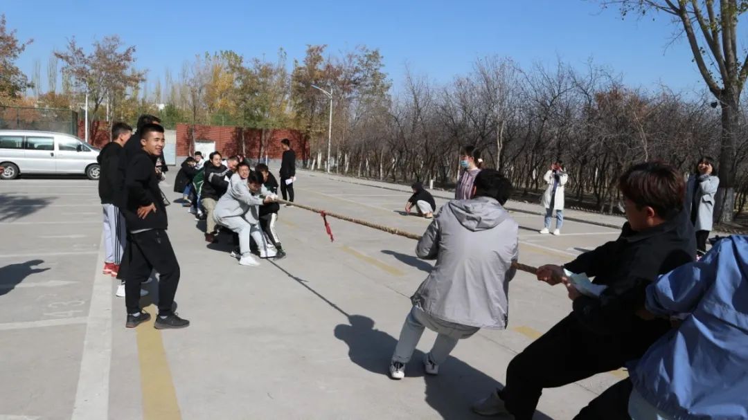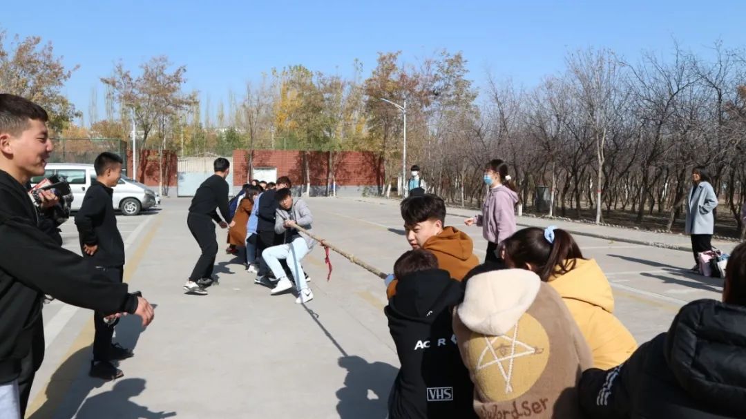 裁判一声令下,双方队员齐心协力,观战的同学的心情随着绳子的移动而起伏。比赛激烈而有序的进行着。