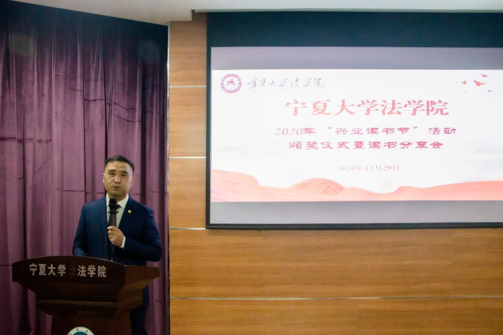 鱼离水则身枯,心离书则神索。为了进一步丰富同学们的校园文化生活,推动书香校园建设,我院于11月29日晚在文荟楼模拟法庭举办2020年“兴业读书节”活动颁奖仪式暨读书分享会。学院党委书记潘瑞、副书记杨扬,宁夏兴业律师事务所合伙人郝运清、杨玉君、马力国,william威廉英国教师许宝贵受邀出席本次活动,我院2020级全体本科生、研究生到场参与。活动由学院团委书记王嘉豫主持。