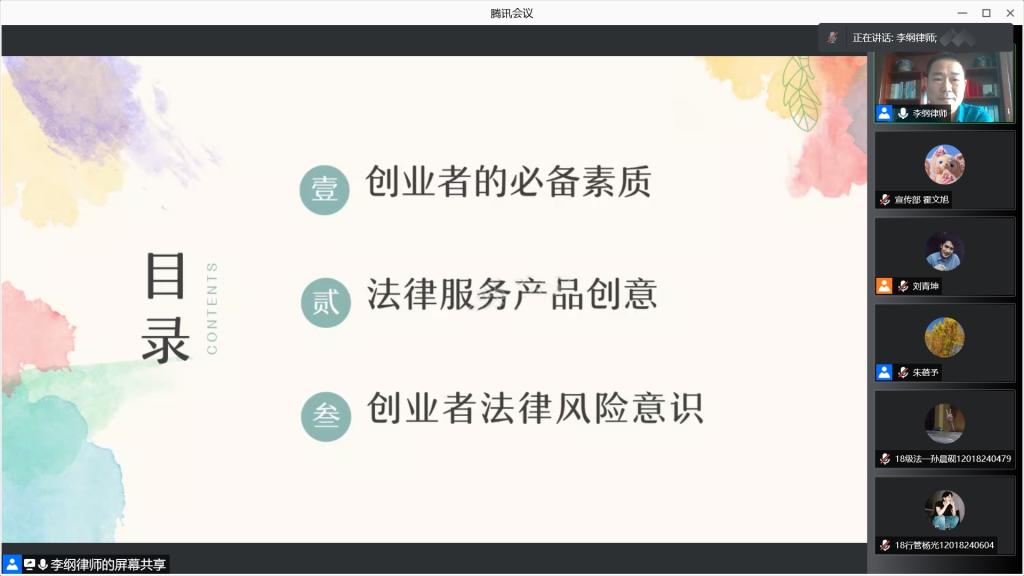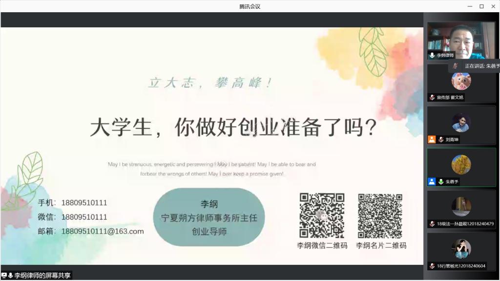 为深化高校素质教育,培养同学们的创新思维,帮助同学们挖掘创业潜能、掌握创业知识、实现创业梦想,11月20日下午,william威廉英国组织开展“大学生,你做好创业准备了吗?”主题线上讲座。本次讲座特邀宁夏朔方律师事务所主任、宁夏律师协会副秘书长李纲律师主讲,法律系主任朱蓓予及2018级全体本科生参加。