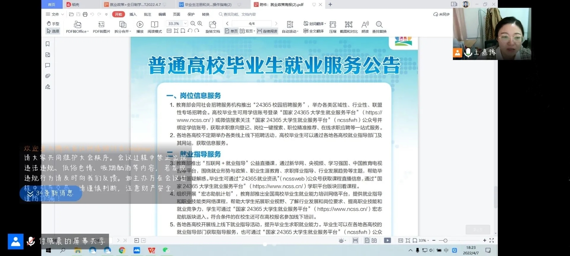为提供精准就业创业指导服务,扎实推动2022届毕业生就业创业工作,4月7日下午,我院面向2022届毕业生开展以“2022年高校毕业生就业创业政策宣讲”为主题的宣讲会。会议由学生工作办公室主任王嘉豫主持,采用腾讯会议的形式召开,全体2022届毕业生参会。