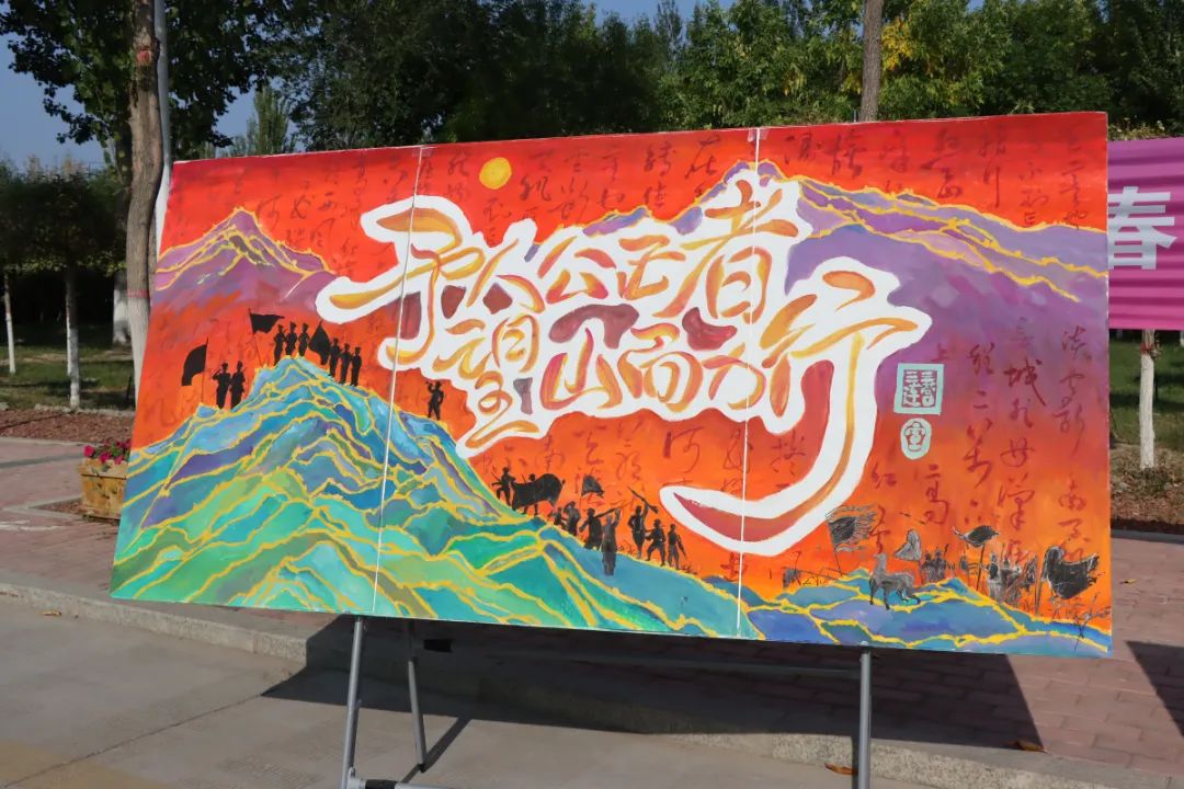 深红的底色震撼人心,草书书写着毛主席的诗文,体现了我们对一个革命时代底色的理解。画面中巍峨的贺兰山雄踞云间。前景是从古到今的军人剪影由低到高排开,千年前,将士们捧浊酒一杯于贺兰山勒马,在烽火狼烟里执戟持刃,在玉门的羌笛声里书写着封狼居胥的辉煌,谱写着保家卫国的壮歌;百年前,战士们在暴风骤雨里拼斗疆场,用血肉与热血构筑起华夏民族的长城,用青春与生命换取了华夏的全新天地;时代的考题已经列出,我们的答卷正在写就,峥嵘过去已经彪炳史册,璀璨当下正在不断延伸,光明未来需要我们的踏实开拓。