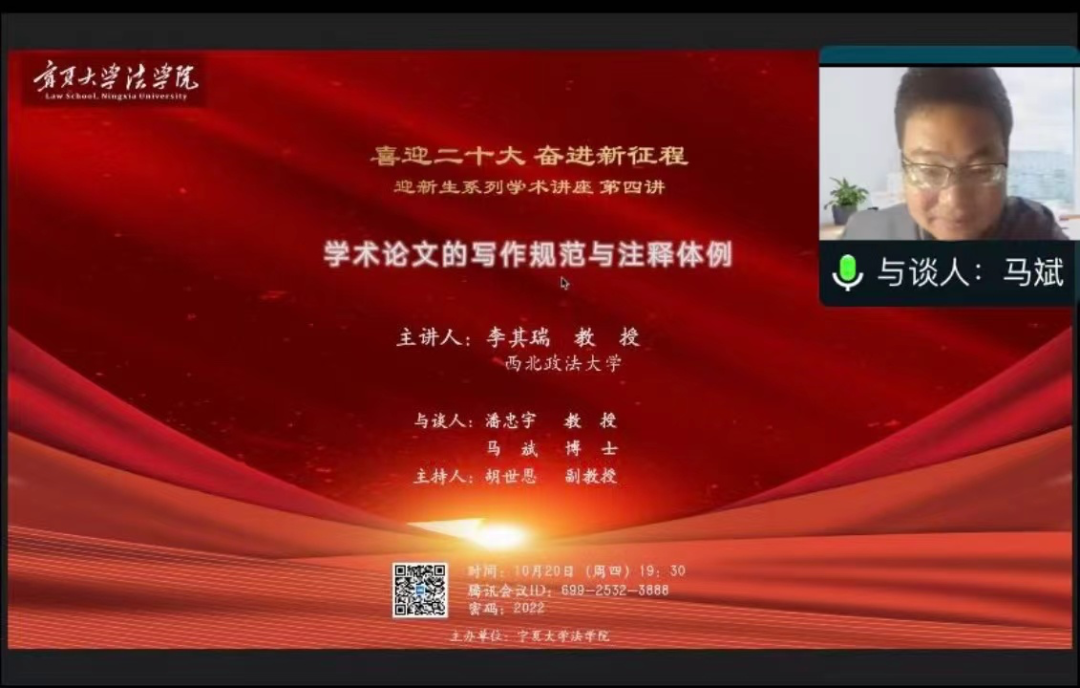10月20日晚7:30,学术讲座第四讲围绕“学术论文的写作规范与注释体例”展开。本次讲座特邀西北政法大学法治文化研究中心主任、马克思主义法学研究所所长李其瑞教授担任主讲嘉宾,我院副院长胡世恩主持,潘忠宇教授、马斌博士出席并担任与谈嘉宾。